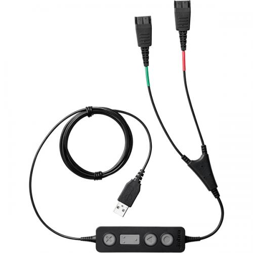 2つのJabra QDヘッドセットを、USBに接続するアダプタ。コンタクトセンターでスーパーバイザーによるモニタリングを可能に。手元で音量の調節や応答・終話・ミュートを操作できるコントローラー搭載。▼関連商品(Jabra 各種QDヘッドセット)