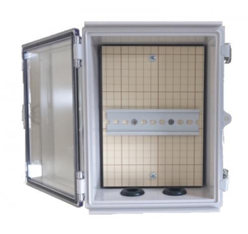 35mmDIN レールが装着されたフタ付き樹脂ケース。 35mmDINレール取付対応の小型制御機器や通信変換器などの屋外設置に最適です。ケーブル穴 2 個 。