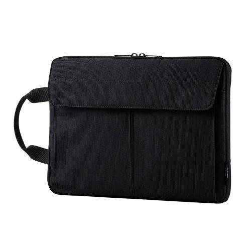 ■ケース前面には、用途に応じて使い分けできる2つの仕分けポケットがあり、マチ付きでマウスなど厚みがある小物の収納に便利です。 ■前面ポケットはワンタッチで大きく開く面ファスナー開閉式のフタ付きで、カバンの中で中身がこぼれ落ちる心配もありません。 ■気室が大きく開閉して収納物の出し入れがしやすい、ダブルファスナー仕様のL字開閉設計です。 ■ハンドル付きで、カバンに入れていても取り出しやすいです。 ■パソコンを衝撃や傷から守る、やわらかなクッション素材を使用しています。 ■軽量でスリムな設計なので、カバンに入れてもかさばりません。 ■外形寸法:W約328mm×D約20mm×H約240mm ※ハンドル含まず ■内寸:W約308mm×D約18mm×H約220mm ※13.3インチノートパソコンの参考収納寸法 ■対応モデル:13.3インチまでのノートパソコン ■パソコン収納部内寸備考:※W約308mm×D約18mm×H約220mmが対応端末サイズとして最大です。これより小さい寸法の端末の収納に対応します。一部の端末は対応しない場合があり、保証の限りではありません。 ■ポケット(前面):オープンポケット×2(フラップ付き) ■カラー:ブラック ■材質:ポリエステル ■重量:約220g
