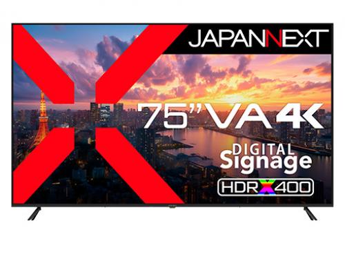 75インチのVAパネルを搭載し、4K(3840x2160)解像度に対応した大型液晶モニターとなります。4KはフルHD(1920×1080)解像度の約4倍の作業領域を実現する3840×2160ドットの解像度となります。高画質VAパネルを採用。4800:1の高コントラスト比は、より黒をくっきりと表現をすることが可能。最大輝度400cd/m2、sRGB:99%の広色域に対応した液晶パネルはHDR400相当の性能を持ちます。HDR(ハイダイナミックレンジ)は、明るい部分も暗い部分もくっきり表現。インターフェイスは、HDMI 2.0 x3、USBポートを搭載。デジタルサイネージとしてもご利用できます(屋内使用のみ)。また、ビデオ/音声入力端子x1、コンポーネント入力端子x1、オプティカル音声出力端子x1を搭載。長時間使用時に眼に優しいフリッカー(ちらつき)軽減モードおよび、ブルーライト軽減モードを搭載します。200x300mmのVESAマウントに対応しますので、対応の壁掛け金具やスタンドなどに取り付けが可能です。10Wx2のスピーカーを内蔵します。便利なリモコンを同梱。USBメモリ再生、メニュー操作、音量調整や入力切替などの操作を行えます。なお、3年保証モデル「JN-V750U-M-H3」および5年保証モデル「JN-V750U-M-H5」も同時に発売となります。