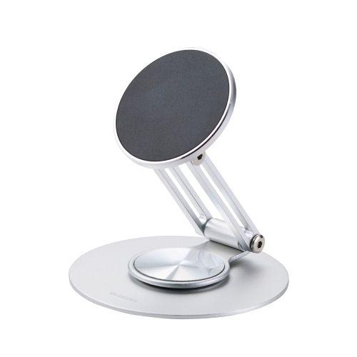 ■マグネットで簡単にスマートフォンの着脱可能。MagSafe対応スマホケースや付属のメタルプレートと併用することで、MagSafe非対応の端末でも使用できます。 ■マグネット部分は360度回転し、スマホの縦向き・横向きの切り替えがスムーズです。 ■折り畳み式で使わないときも場所を取らず、スッキリ収納できます。 ■上下180度の角度調節に加えて、土台も360度回転。パノラマ撮影や動画視聴など、設置場所や使用シーンに合わせて自由に使えます。 ■スマートフォンやケースの形状を気にせずしっかり固定できるため、ケースの厚みなどで角度が不安定にならず、快適に使用できます。 ■対応機種:MagSafe対応iPhone ※2025年12月現在。磁力装着できない機種は、付属のメタルプレートを貼り付けて使用可能です。 ※ケースの材質、厚みなどによって対応できない場合がありますのでご了承ください。 ■外形寸法:W約98mm×D約98mm×H約22mm(折り畳み時) ■内容物:スタンド×1、メタルプレート×1 ■材質:スタンド:アルミニウム・PVC・シリコン、メタルプレート:鉄 ■重量:スタンド本体:約117g、メタルプレート:約2g ■耐荷重:約300g ■カラー:シルバー
