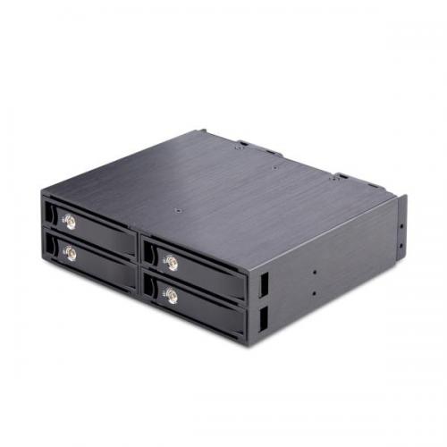 ●4台のU.2を5.25インチベイに集約できるバックプレーンです。●4台のU.2(SFF-8639)NVMeドライブを搭載可能です。●7mmから15mmの2.5インチNVMe SSDに対応し、各ドライブを独立したMini-SAS(SFF-8643)接続で最大32Gbpsの転送速度を実現します。●ロック機構付きドライブトレイ(鍵2本付属)によりドライブを安全に保持し、誤操作によるホットスワップのトラブルを防止します。●アルミ製ボディを採用し、放熱性を高めることで高負荷環境でもドライブの温度上昇を抑えて安定した動作を維持します。●通気孔付きトレイ、前面吸気口、背面のデュアルファンにより効率的なエアフローを確保し、卓越した冷却性能を発揮します。●背面スイッチでファンの風量を高/低の2段階に切り替えられ、設置環境に合わせた静音性と冷却性能の調整が可能です。●Storage Spaces、RAID Assistant、mdraid/mdadmなど主要ストレージ管理システムに対応し、OS標準機能でそのまま使用できます。●4本の61cm Mini-SAS HDケーブルと取付けねじを同梱し、SATA電源1本で4台のNVMeドライブに給電できるため、導入も容易です。