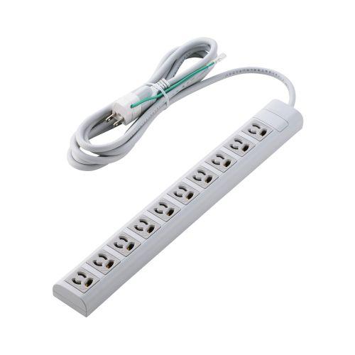 ■プラグと差込口はそれぞれ3ピン接続の構成で、10口ある差込口には抜け止め機能を備えています。 ■差込口仕様:3ピン ■差込口個数:10口 ■差込口間隔:35mm(差込口中心間寸法) ■プラグ仕様:3ピン ■ACコード長:3m ■定格:15A、125V、合計1500Wまで ■スイッチ:× ■雷ガード:○ ■ホコリシャッター:× ■抜け止め機能:○ ■差込口キャップ:× ■通電表示ランプ:× ■二重構造:△(差込口周りのみ) ■二重被ふく:○ ■絶縁キャップ付きプラグ:× ■スイングプラグ:× ■マグネット:○ ■吊り穴:× ■ブレーカー:× ■ノイズフィルター:× ■モジュラージャック:× ■連動機能:× ■変換アダプター:○ ■カラー:ライトグレー ■材質:ABS樹脂、UF樹脂、PVC樹脂 ■外形寸法:幅約50mm×奥行約400mm×高さ約32mm ※本体のみ(突起部を除く) ■質量:約770g ■付属品:3ピン→アース線付き2ピン変換アダプター ■環境配慮事項:THINK ECOLOGY対応、EU RoHS指令準拠(10物質) ■使用可能地域:日本国内専用 ■法規:◇PSE(特定電気用品) ■保証期間:1年間