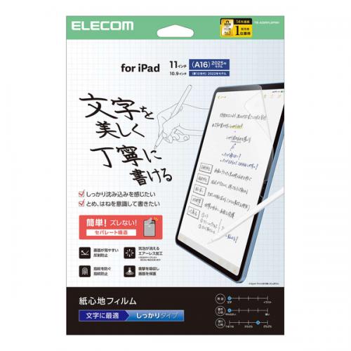 ■画面を傷や汚れから守る、指紋防止、反射防止タイプの紙心地フィルムです。 ■特殊構造により、しっかりとしたペンの沈み込みを実感でき、「文字を書く」ことにこだわった仕様です。 ■ペン先が滑らずしっかり止まるため、文字特有のとめ・はねの表現がしやすく文字を美しく書くことが可能です。 ■時間の経過とともに気泡が目立たなくなる、特殊吸着層を採用したエアーレス加工を施しています。 ■小さな気泡ができたときには、指などで押し出すことで気泡を抜くことができます。 ■指紋が付きにくく、残った場合でも簡単に拭き取れる指紋防止加工を施しています。 ■フィルムを貼ったままでも端末操作ができるタッチスクリーン入力に対応しています。 ■対応機種:iPad(A16)、iPad (第10世代 2022年モデル) ■対応モデル番号:A3356、A3355、A3354、A3162、A2777、A2757、A2696 ■セット内容:画面保護フィルム(紙心地・反射防止・文字用・しっかりタイプ)×1、ホコリ取りシール×1、クリーニングクロス(乾式)×1、ヘラ×1 ■材質:接着面:シリコン、外側:PET
