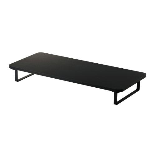 ■27インチまでのディスプレイ(パソコンモニター)に対応したディスプレイスタンドです。 ■約8cmの台でディスプレイ使用時の目線を上げられるため、パソコン作業の際の姿勢を改善します。 ■ディスプレイスタンドの下のスペースを有効活用してデスクの上を広く使うことができます。 ■パソコン不使用時にはディスプレイスタンドの下のスペースに横幅約50cmまでのフルキーボードを収納可能です。 ■工具不要の簡単組み立て仕様です。 ■脚部にはゴム脚がついているので、机上に設置しても滑りにくく安定してご使用いただけます。 ■エレコム社環境認定基準を1つ以上満たし、『THINK ECOLOGY』マークを表示した製品です。 ■環境保全に取り組み、製品の包装容器が紙・ダンボール・ポリ袋のみで構成されている製品です。 ■対応サイズ:~27インチディスプレイ ■耐荷重:10kg ■サイズ:幅約590mm×奥行約260mm×高さ約82mm ■質量:約1.62kg ■カラー:ブラック ■材質:パーチクルボード、スチール ■その他:ディスプレイスタンド下部内寸:幅約505mm×奥行約260mm×高さ約70mm