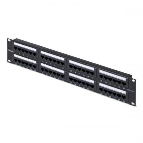 ●48ポート Cat6 UTP パッチパネルです。●視認性に配慮したラベル付きRJ45ポートを備えた48ポート設計で、配線の識別や管理を容易にし、高密度なネットワーク環境をすっきり整理できます。●2Uサイズのスチール筐体にブラックのパウダーコーティングを施し、耐久性と耐腐食性を考慮した設計で、ラック内に安定して設置できます。●金めっきRJ45コネクターと110パンチダウン端子を採用し、固定配線環境において安定した信号伝送と長期的な運用を支えます。●ANSI/TIA-568-C.2 Cat6規格に準拠し、1GbEおよび10/100Mbpsイーサネットに対応した一貫性のある信号品質を確保します。●T568AおよびT568B配線に対応したカラーコード付き110ブロックにより、終端処理を効率化し、施工時のミスを防ぎます。●番号付きポート配置により、設定変更や保守、トラブルシューティング時の作業効率を高めます。●標準19インチラックやキャビネットに対応し、Cat6およびCat5eの単線・より線ケーブルを使用したLAN配線の集中管理に適しています。●StarTech.comでは製品に関するご質問やご相談を公式ウェブサイトのお問い合わせフォーム、メール、電話にて承っております。