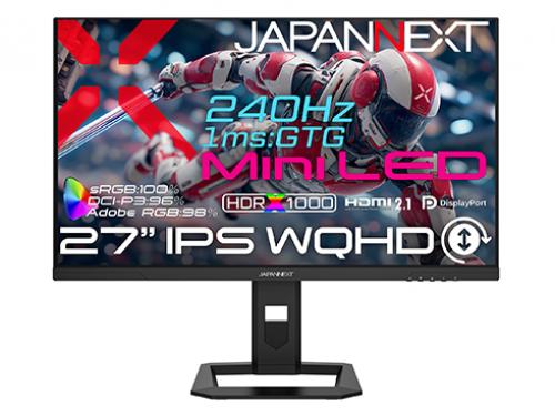 27インチのIPSパネルを搭載し、Mini LEDバックライトを採用したWQHD(2560×1440)解像度のゲーミングモニターです。Mini LEDバックライトとローカルディミング(エリア別バックライト制御)により、黒つぶれや白浮きを抑えたリアルな映像を実現します。SDR表示時450cd/m2、HDR表示時のピーク輝度1000cd/m2に対応し、APL15%時(画面の一部が明るいシーン)でも最大1500cd/m2を実現。HDR1000相当の性能を備えています。sRGB 100%、DCI-P3 96%、Adobe RGB 98%の広色域に対応。HDR(ハイダイナミックレンジ)対応で明るい部分も暗い部分もくっきり表現。240Hzの高速リフレッシュレート、1ms(GTG:OD時)の高速応答速度に対応。また、可変リフレッシュレート(VRR)にも対応。スタンドは高さ調整(最大120mmの範囲)、ピボット(回転)、スイーベル(首振り)機能対応。入力端子はHDMI 2.1x2、DP 1.4を装備。複数の入力映像を同時に表示するPIP(Picture In Picture)とPBP(Picture By Picture)に対応、PIPではもう一つの入力画面を子画面で同時表示が可能。PBPでは2つの入力を左右に同時表示することが可能。100×100mmのVESAマウント対応。スピーカーは内蔵しておりません。本製品には、2年間のメーカー保証が付きます。