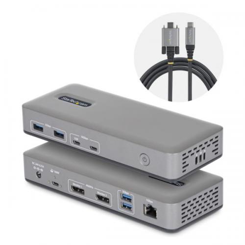 ●USB Type-Cポート1口から、ノートPCのネイティブGPUで駆動する非圧縮映像により、最大2台の4K 60Hz DisplayPortディスプレイに接続できます。●ソフトウェア圧縮を使用しない設計のため、高解像度環境でも映像の遅延や劣化を抑え、高負荷な業務用途に対応します。●Windows環境ではドライバーや専用ソフトウェアのインストールが不要で、プラグアンドプレイで導入できます。注意:macOSおよびChromeOSではドライバーのインストールが必要です。●BYODや共有ワークスペースなど、個別設定を最小限に抑えた展開を想定した運用に配慮しています。●USB-A 5Gbps×4、USB-C 10Gbps×2(うち1ポートは最大15W給電)を搭載し、多様な周辺機器を性能を損なわずに接続できます。●ギガビットイーサネットポートを備え、業務用途で求められる安定した有線ネットワーク接続に対応します。●ロックスロットを内蔵し、SurfaceマウントやVESAマウントに対応することで、設置性と物理的なセキュリティを考慮した運用が可能です。●StarTech.comでは製品に関するご質問やご相談を公式ウェブサイトのお問い合わせフォーム、メール、電話にて承っております。
